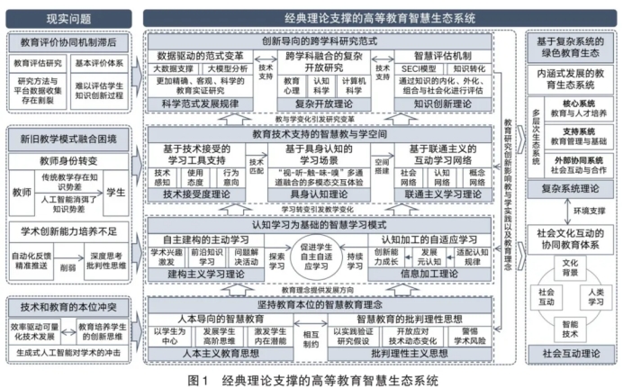 因此,本研究提出高等教育中的智慧教育是指人工智能等先进技术与高等教育学深度融合的产物,旨在通过智能技术优化教学过程与教育管理过程,并提高学术研究水平与综合教育质量。通过将哲学、认知科学、复杂科学等学科的经典理论作为学理分析基础,解决在高等教育中,智慧教育实践的理论逻辑不明晰的核心问题。并以此问题为导向,挖掘其中存在的教育与技术本位冲突、新旧教学模式融合困难,以及教育评价协同体系的滞后等问题,从而对智慧教育应用与实践的理论机制展开系统性、科学性的综合分析。