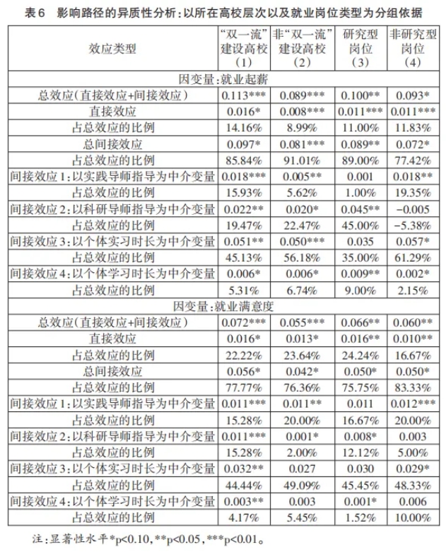 进一步根据影响路径的分析结果可知,各组的间接效应均高于直接效应。具体来说,当以就业起薪为因变量时,实践导师指导、科研导师指导、个体实习时长以及个体学习时长对专硕生的就业起薪均产生了显著的间接正面影响,其中个体实习时长的效应占比最高。而当以就业满意度为因变量时,这四条路径同样对非“双一流”建设高校专硕生的就业满意度产生了积极的间接影响。但对于“双一流”建设高校的专硕生而言,个体实习时长和个体学习时长的间接影响则变得不显著,这可能反映了“双一流”建设高校的专硕生在就业时更加看重工作的本质内容、长远的职业发展前景、舒适的工作环境以及工作与个人价值观的紧密契合,这些因素在他们评估就业满意度时占据了更为重要的地位。因此,即便他们通过长时间的学习和实习提升了就业起薪,但如果这些其他满意度维度无法得到满足,他们的就业满意度的在学习和实习时长这两大间接影响上仍可能不显著。