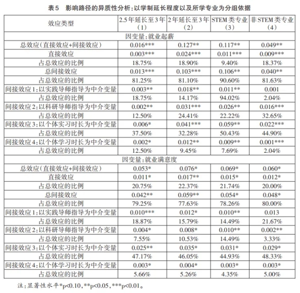 1.学制延长程度的异质性。由于专硕生的学制存在2年、2.5年和3年三种情况,若高校考虑学制延长的程度,则可能涉及由2年延长至3年(即延长1年)或由2.5年延长至3年(即延长0.5年)两种情况。学制延长的时长不同,很可能会对专硕生就业质量产生不同程度的影响。因此,在表5(1)(2)列中,本部分对学制延长程度进行了划分,并进行了分组的总效应和影响路径分析。在总效应层面,学制延长的程度越大,对专硕生的就业起薪和就业满意度的提升效果就越显著。具体来说,学制由2年延长至3年对专硕生的就业质量的积极影响,要高于学制由2.5年延长至3年所带来的影响。