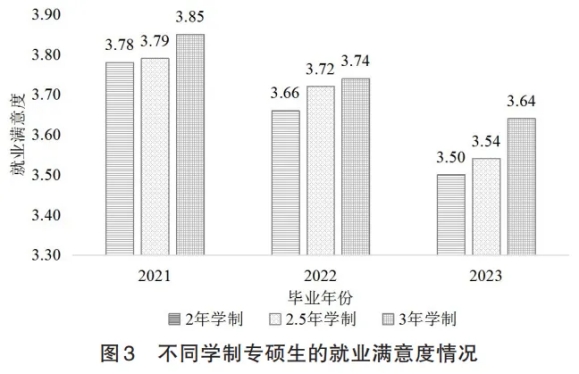 同时,图3展示了不同学制下专硕生就业满意度情况。从2021年至2023年,无论是2年学制、2.5年学制还是3年学制的专硕生,其就业满意度均有所降低。具体来说,2年学制专硕生的就业满意度从2021年的3.78到2022年的3.66,最终降至2023年的3.50,2.5年学制的满意度从2021年的3.79到2022年的3.72最终降至2023年的3.54,3年学制的满意度则从2021年的3.85到2022年的3.74,最终降至2023年的3.64,且2年学制专硕生的就业满意度下降幅度最大。这种普遍下降的现象可能反映了就业市场的竞争加剧、经济环境的变化或其他外部因素对毕业生就业体验的影响。