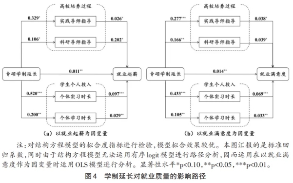 4.就业岗位的异质性。由于就业岗位性质的差异,雇主对专硕生的青睐角度也会有所不同。例如,研究型岗位的相关雇主往往更看重专硕生的科研背景,而非研究型岗位则更侧重于其实习经历。因此,本研究将专硕生毕业时的就业岗位类型进行分类,并分别进行了总效应及影响路径分析[如表6(3)与(4)所示]。分析结果显示,学制延长对选择两类岗位专硕生的就业质量具有显著的正向影响,且两类群体间的影响差异不显著。