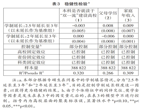 同时,本研究可能存在一定的自选择偏差问题,即当高校专硕生学制延长时,学生有可能会主动选择同一层次短学制的高校进行深造,从而导致估计结果产生偏误,需识别学制延长前后,各高校招收的专硕生特征是否发生了差异。如表3所示,将同一高校同一专业的学制延长与未延长时,所招收专硕生的特征(本科院校、家庭背景)进行分析,发现学制延长与否,其特征均无显著差异。