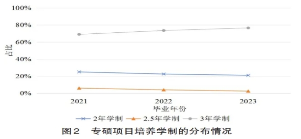 本研究针对专硕项目培养学制分布进行了逐年描述,如图2所示,该图总结了各调查年份调查高校中不同专硕生学制的分布情况,2年或2.5年学制的所在高校占比逐年递减,说明在调查年份内,部分高校的专硕生学制从2年或2.5年延长至3年。
