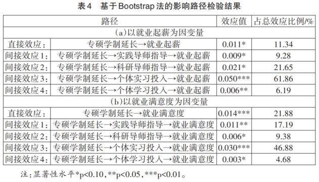 同时,为进一步测度影响路径中的直接效应和间接效应的大小及占比,因而采用Bootstrap方法随机抽样500次进行结果检验,如表4所示。在专硕生学制延长对就业起薪的影响路径中,直接效应占总效应的比例为11.34%,以实践导师指导、科研导师指导和个体实习投入、个体学习投入为中介变量的间接效应占总效应的比例分别为9.28%、21.65%、61.86%和6.19%,这表明专硕生的学制延长主要是通过增加专硕生个体的实习时长来提高其就业起薪。在专硕生学制延长对就业满意度的影响路径中,直接效应占总效应的比例为21.88%,以实践导师指导、科研导师指导和个体实习投入、个体学习投入为中介变量的间接效应占总效应的比例分别为17.19%、9.38%、46.88%和4.68%,这表明专硕生学制延长主要是通过促进专硕生个体的实习投入程度来提高其就业满意度。由此可见,学制延长对专硕生就业质量的影响主要是由个体实习时长起主要作用,且仍存在一定的直接效应。基于信号筛选理论可知,其直接效应存在一定的信号作用:专硕生学制的延长,向劳动力市场中的雇主传递了一个关于教育质量提升的重要信号。雇主们倾向于认为,经过额外半年或一年培养的学生,在能力积累与专业知识学习方面将实现更为显著的增值。因此,这类专硕生在就业市场上往往能够获得雇主的更多青睐。当然,该直接效应也有可能是存在未观测到的能力增值,但限于数据无法直接检验,有待进一步探索。