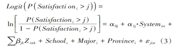 最后,在探究学制延长对专硕生就业满意度的影响时,由于就业满意度为定序变量,因而本研究构建了如公式(3)所示的定序逻辑回归(Ologit)模型: