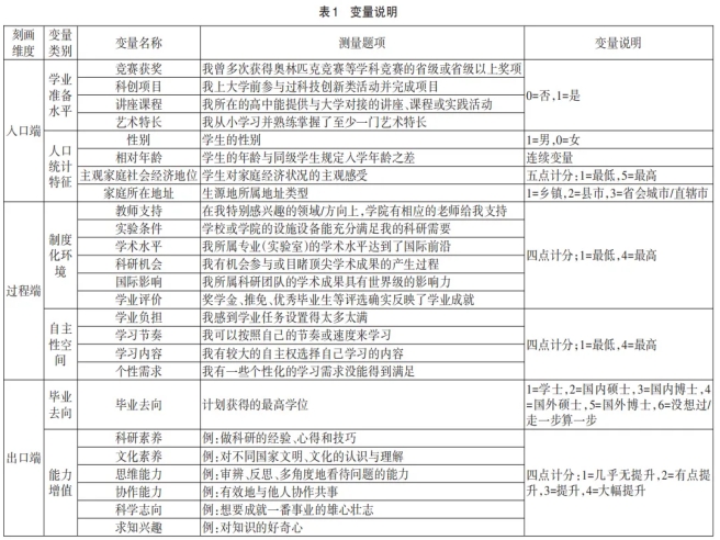 出口端变量包括毕业去向和能力增值两个维度。其中,毕业去向是衡量选育效果最直观且真实的指标,但在当前本科生毕业后大多读研的情况下,该指标的区分度相对有限。能力增值能够全面反映拔尖创新学生的能力品质在经过系统培养后的变化情况,是评估培养效果的有效指标,本研究基于孙迟瑶和陆一提出的拔尖创新人才品质,从科研素养等成就素质和科学志向等内在驱动指标对拔尖计划学生的能力增值情况进行评估。测量题目采用李克特四点量表计分,作连续变量处理,各维度得分为同一维度内所有题目的平均分。(见表1)