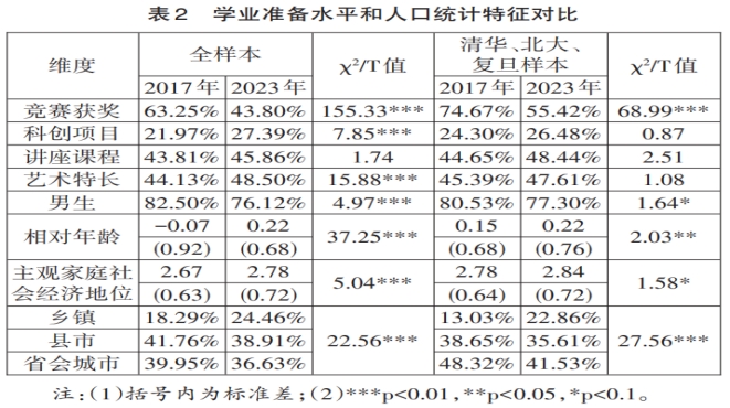 表2展示了两次调查中拔尖计划学生进入大学前的学业准备情况和人口统计特征。结果显示,从2017年到2023年,拔尖计划学生在中学阶段参与科技创新类活动、修读大学讲座课程、从小学习并熟练掌握了至少一门艺术特长的比例均有提升,分别提升至27.39%、45.86%和48.50%,这与大学高中衔接教育项目的普及、日益激烈的高等教育升学竞争有关。与此同时,参与奥林匹克竞赛等学科竞赛并获得省级或省级以上奖项的比例下降,这可能是由于拔尖计划规模扩大但竞赛获奖名额并未发生明显扩大。总体而言,近年来进入拔尖计划的学生展现出较高的综合素质,他们在艺术特长、先修课程修读以及科创项目参与等方面进行了积极探索,综合素养有所提升。在入学前学业准备情况方面,清华、北大、复旦样本的变化趋势与全样本一致,但在两次调查间不存在显著差异,其原因在于在第一次调查期间顶尖高校拔尖学生的学业准备水平已达到较高水平,在两次调查间变化幅度相对有限。