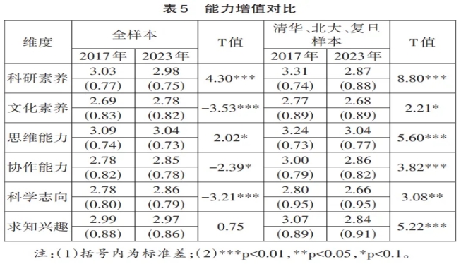 拔尖计划学生进入大学后的能力增值可以直观反映拔尖计划的培养成效。表5显示,拔尖计划学生在文化素养、协作能力和科学志向方面的增值显著提升,但在科研素养、思维能力和求知兴趣方面的增值略有减少。上述变化趋势与社会环境变化有关,也可能与学生在大学阶段面临的多样化选择和压力有关,需要高校优化培养方案,加强在科研和创新思维方面的引导和支持,以确保拔尖计划学生在指向原始创新的科研素养、高阶思维等关键能力上得到充分发展。清华、北大、复旦样本在能力增值的6个维度均下降,这与该群体所感知的制度性支持和自主性空间有限相关,同时也可能是由于清华、北大、复旦等顶尖高校学生本身起点较高,能力增值空间相对有限,若培养模式未能持续提供挑战性支持,可能出现“高原效应”。