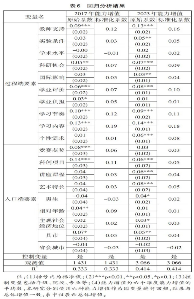 在分别比较两次调查期间拔尖计划选育成效在入口端、过程端和出口端的差异基础上,本研究进一步分析了入口端、过程端与出口端不同选育要素之间作用关系的阶段性变化。(见表6)研究发现,大学制度化环境、大学自主性空间、大学前超前学习和家庭背景在两次调查中均对拔尖计划学生能力增值具有显著影响,其中,充分教师支持、自主决定学习节奏和学习内容对能力增值的影响效应较大。与2017年调查结果不同,在2023年调查中,充分教师支持、先进实验条件、前沿科研机会、个性需求得到满足对人才培养的影响作用提升,其中个性需求得到满足的提升幅度最大。上述培养要素的影响效应提升与近年来各拔尖项目对大师引领、科研育人、个性化培养等方面的重视程度提高有关,同时也说明在不同时空条件下,拔尖计划学生的成长需求随之变化,不同培养举措可能发挥不同的作用,需要结合条件变化因时调整。