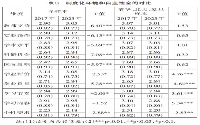 表3显示,在2017年调查中,拔尖计划学生对所在项目的教师支持、实验条件、学术水平、科研机会、国际影响和学业评价等制度化环境的评分分别为2.90、2.98、2.83、2.64、2.47和3.14;在2023年调查中,对上述维度的评分分别为3.05、3.12、2.98、2.84、2.65、3.08。从2017年到2023年,拔尖计划学生对大学制度化环境评分普遍提升,而对学业评价体系合理性的评价得分显著降低,这表明,在致力于提升教育质量的过程中,不仅要优化教育资源和环境,还需关注评价方式的更新与完善,传统的评价体系可能无法完全匹配拔尖计划学生的多元化发展需求。清华、北大、复旦样本结果表明,顶尖高校拔尖计划学生对6项制度化环境感知得分均略微下降,但除学业评价体系合理性外,其他5个方面的下降并不显著,其原因在于,3所高校本身在资源投入方面已经处于较高水平,这与资源基础相对薄弱院校的提升“可见度”形成对比,使得学生感知到的培养环境变化不如其他院校明显。