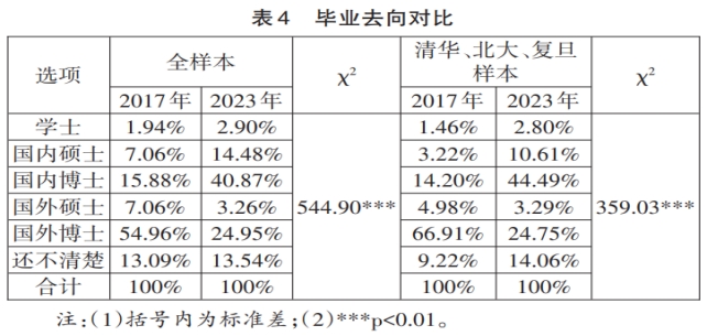 随着拔尖计划从1.0推进到2.0阶段,拔尖计划学生本科毕业后选择国外深造比例减少,国内深造比例大幅提升。其中,国外读博比例从54.96%下降至24.95%,国外读硕比例从7.06%降低到3.26%,而国内读博、国内读硕比例分别从15.88%、7.06%上升至40.87%、14.48%。这与国际形势、就业“性价比”、研究生扩招以及强基计划提供的本研一体化培养政策有关,同时也反映了我国拔尖创新人才自主培养的巨大潜力。在毕业去向方面,清华、北大、复旦样本与全样本变化趋势一致。(见表4)