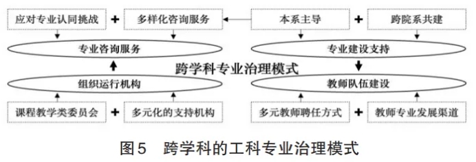 跨学科专业治理模式包括专业建设支持(如承担专业设置和课程开发的工学院、工程教育系等院系组织)、教师队伍建设、专业咨询服务,以及组织运行机构(如课程委员会、校友委员会、业界咨询机构等),二者分工协作,为跨学科专业的健康运行和可持续发展提供保障。例如,拉法叶文理学院工程学专业由工学部设立,(见图5)但与艺术与文化、自然科学、社会科学学部共同强化工科学生“大图景”的系统思维和博雅教育,使学生不仅具有工科基础和技术背景,而且能够具备人文、社会科学和自然科学的视野。多个院系和学科的参与意味着不仅学生需要自己整合不同学科教师的合作指导,教师也需要学校和院系提供支持以积极投入跨学科的课程设计和教学中。因此,跨学科的工科专业从教师联合聘任和教师专业发展两方面着手调动参与专业建设教师的积极性,除了不同院系联合聘任这一常见的方式外,认可教师在多学科交叉工科专业的教学工作并支持其在本专业获得长聘资格成为推动跨学科专业发展的有效举措。如卡内基梅隆大学工程与公共政策专业教师包括专任师资、“五五比例兼聘”和客座兼聘三种方式,不仅设置了研究型、服务型、企业型等多种类型的兼聘岗位,而且支持“五五比例兼聘”型教师在两系同时获得长聘资格。普渡大学工程与公共政策专业同样采取兼聘和双边长聘的方式。不同于机械工程等传统工科专业,学生、教师、校友、业界、公众等理解跨学科的工科专业设置的意义,成为应对专业认同危机、实现专业可持续发展的关键;理解和认同的前提是建立关联。对此,跨学科的工科专业通过咨询、监督、共建等活动调动多方积极性,使学生在院系、教师、校友、业界、咨询机构等主体间发挥“黏合剂”的作用,让专业建设、教师发展、学生培养和外部环境互联。其中,专业相关和职业发展咨询机构是学生主导设置个人专业方向的有力支撑和保障。此外,跨学科的工科专业还围绕项目、课程、校友等专业建设要素设立形式多样的课程教学类委员会,吸纳多方力量参与和支持专跨学科工程创新人才培养。