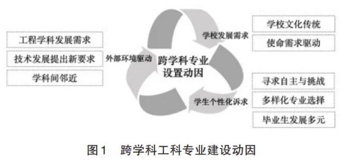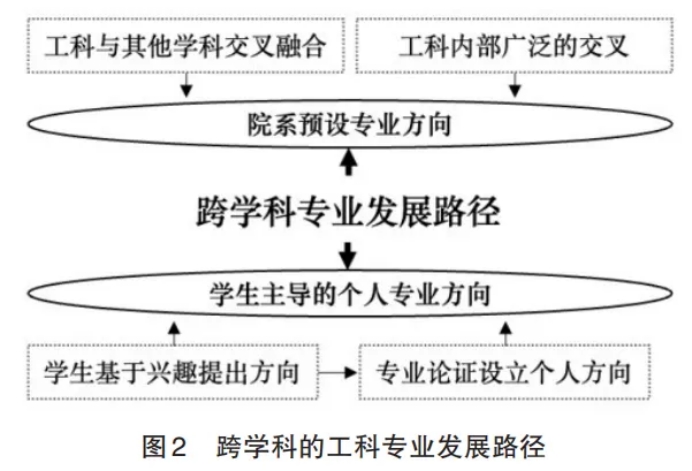 跨学科工科专业设置受到外部环境驱动、学校发展需求和学生个性化诉求的共同影响,而专业发展则通过预设专业方向和学生主导的个人专业方向两种路径实现动态调整。由此观之,跨学科不是多门学科的简单叠加,而是基于经济社会、产业、技术当前和未来发展需求的交叉。一方面,工程和技术科学的重大创新和核心技术突破不断推动新兴产业和未来产业涌现,不仅催生新的学科增长点和新专业,而且驱动工程学科的纵深化发展,与其他学科在知识、理论、方法、技术和工具等方面加速融合、有机结合。另一方面,制度化的工程教育和专业建设要打破学科专业界限不仅需要调整传统院系设置等组织制度设计以满足多学科交叉的理念和需求,而且要统筹考虑已有学科专业布局及其与产业发展需要的联系,而专业又是高校人才培养的基本单元,因而可能出现工程创新人才培养与新技术、新产业发展的需求不相适应的局面。实践和政策层面,我国自2017年启动实施新工科建设以来,跨学科工程创新人才培养就成为工程教育改革的主要方向之一;但由于受到自19世纪以来确立的学科制度的“规训”,要在以学科为主要结构的大学中推动跨学科工程人才培养,受到院系设置、教师聘任及考核、学科文化及认同等诸多制度因素的影响。因此,上述跨学科的工科专业建设及人才培养实践提供了一种依据国家战略需求和科技发展趋势优化专业设置和人才培养模式的可行思路:既依托传统工科扎实的知识、方法和工具积累,又根据经济社会发展和产业需求灵活调整学科专业结构布局,整合大类工科专业并把握新技术、新产业快速发展背景下工科与其他学科的联系,通过拓宽工科学习口径、灵活设置专业方向等方式培养学生综合运用多学科知识和跨学科思维解决工程实际问题的能力。