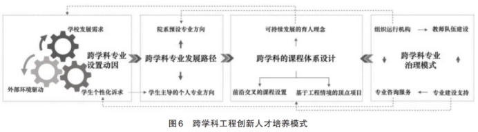 工程、科技、人才已经成为发展新质生产力、实现高水平科技自立自强的驱动要素,是经济社会发展的重要引擎。现代工程科技的理论创新和技术突破往往源自工程与科学、技术、人文、社会等交叉融合,能够通过多学科交叉融合形成工程创新人才培养的新动能和新优势。本研究通过多案例探索,揭示了由跨学科专业设置动因、跨学科专业发展路径、跨学科课程体系设计、跨学科专业治理模式四大维度11个子维度构建的跨学科工程创新人才培养模式框架。(见图6)这一模式引发了本研究关于当前依据科技创新趋势优化调整学科专业设置和人才培养模式的深入思考。同时,跨学科工程创新人才培养反映了工程教育在以往制度化学位教育模式基础上的推陈出新,实际上是在既有学科制度内克服“嵌入能动性悖论”的有效尝试,能够有效避免工科专业建设滞后于工程科技创新趋势和产业发展需求;同时,在不颠覆原有学科制度、不改变传统单一工科专业和单一工科专业主导人才培养模式的情况下,为培养工科学生跨学科知识及迁移应用、系统工程思维、人文素养提供了渠道,符合现代科学技术体系发展和工程科技创新的多学科交叉融合趋势和人才培养需求。基于此,4所高校或能够为我国新工科建设和卓越工程创新人才培养提供启发和借鉴。