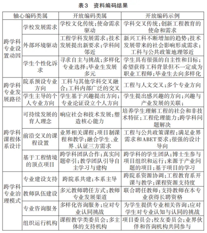 对于获取的研究数据,利用NVivo软件进行编码。由于访谈记录均为英文,因此保留原始英文访谈记录,但采用中文对原始材料进行三级编码。(见表3)一级编码阶段,采用贴标签的方式对访谈原始记录进行概念化和类属化操作,经过持续比较后最终得到96个概念28个类属,共计323个参考节点。二级编码阶段,对开放编码得到的类属进行凝练和修正,经过进一步分析后得到11个类属;在此基础上,探索类属之间的关联并得到跨学科专业设置动因、跨学科专业发展路径、跨学科课程体系设计、跨学科专业治理模式4个二级编码。编码过程中,直到编码或类属范围基本确定,出现的编码或类属不断重复,研究者判断已经达到编码或主题饱和。三级编码阶段,采取提炼核心类属的方式,并通过故事线描绘跨学科工程创新人才培养的模式构建和实践;由于编码的含义及不同类属之间的关系基本确定且不再出现新的信息,研究者判断已经发掘和呈现数据的完整意义,数据达到意义饱和。根据二级编码形成的类属和类属关系,将三级编码归纳为“跨学科工程创新人才培养模式”,围绕这一核心类属呈现出的故事线为:不同类型和定位的高校基于自身发展需求和学生个性化需求,在技术发展等外部环境因素驱动下,通过预设专业方向和学生主导设立个人专业方向不断推动跨学科工程创新人才培养,并通过前沿交叉的课程建设、顶点项目设计响应社会和技术发展趋势,形成以可持续发展为理念的人才培养模式,依托本系或跨院系力量支撑专业建设、建设教师队伍,辅之以专业咨询服务和委员会等组织运行机构持续完善跨学科专业治理。