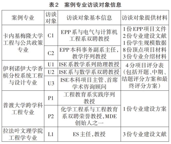 本研究基于理论抽样原则,在初步文献梳理和专家咨询基础上选取4所在工程教育领域具有代表性、在跨学科工程创新人才培养方面有突出实践的美国高校。(见表1)考虑到我国新工科区分工科优势高校、综合性高校和地方高校,且前两类多为研究型大学,因而案例高校以研究型大学为主,包含1所文理学院。其中3所研究型大学工学院均位列全美前十,文理学院工科专业亦居前二十。各校在工程教育领域具有独特影响力:卡内基梅隆大学以工程与社会科学交叉著称,伊利诺伊大学香槟分校以系统工程与设计见长,普渡大学为美国首创工程教育学系,拉法叶文理学院以博雅教育与工科融合为特色。所选专业兼具工科内部及工科与非工科的广泛融合,且相关访谈与资料丰富,具有较强可比性与典型性。需要指出的是,本研究案例专业对应“program”概念范畴,不包括独立于专业的跨学科项目。