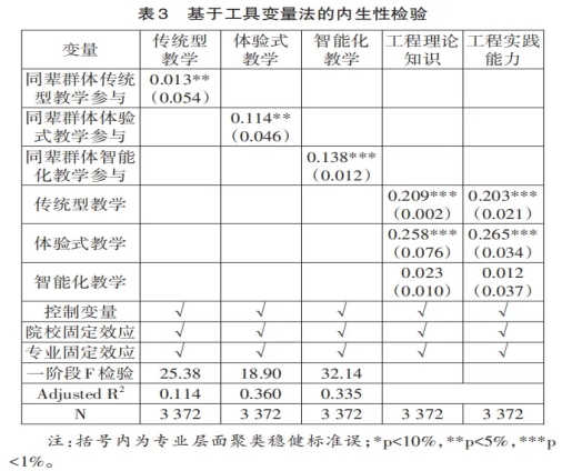 为进一步验证研究结论的稳健性,本研究在原有分析基础上,一是将教学范式的计算方式由原先的等权平均调整为基于因子载荷的加权计算,二是剔除样本占比较低的普通高校数据,以减少样本结构差异可能带来的干扰。重新估计后显示,传统型教学与体验式教学对学生工程理论知识和工程实践能力仍呈显著正向影响,智能化教学的效果依然不显著,结论保持稳健。此外,为规避变量间潜在的内生性问题,本研究参考鲍威等的思路,引入“同辈群体(同学校×同年级×同专业)教学范式参与频次”作为工具变量,采用两阶段最小二乘法(2SLS)进行因果识别。该工具变量能够显著影响个体所参与的教学范式类型,但与被解释变量——工程专业能力不存在直接关联,符合有效工具变量的选取原则。