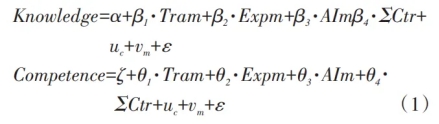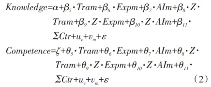 模型(1)中,Knowledge和Competence分别指学生的专业理论知识和实践应用能力,Tram是指传统型教学模式,Expm是指体验式教学模式,AIm是指智能化教学模式,Ctr指控制变量,β1和θ1是传统型教学的系数、β2和θ2是体验式教学的系数、β3和θ3是智能化教学的系数、β4和θ4是控制变量的系数,α和ζ分别是工程理论知识和工程实践能力模型的固定截距,容纳了可能未观测到的区域特征,uc、vm分别为院校固定效应和专业固定效应,ε为随机误差项。
