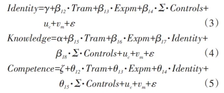 其中,Identity表示职业认同中介变量,其余变量与模型(1)一致。中介效应检验方面,采用两阶段回归依序对模型(3)、模型(4)和模型(5)进行回归,若β12、β13和β17、θ14同时显著则表明传统型教学与体验式教学能够通过职业认同提升学生工程理论知识与工程实践能力。此外,若β15、β16、θ12、θ13显著表明存在非完全中介效应,不显著则表明存在完全中介效应。