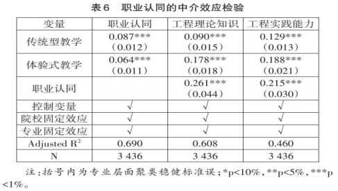假设6:职业认同在教学范式对学生工程理论知识与工程实践能力的影响中发挥中介作用。