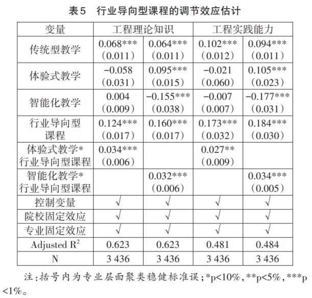 假设5:行业导向型课程显著正向调节智能化教学对学生工程理论知识与工程实践能力的影响。
