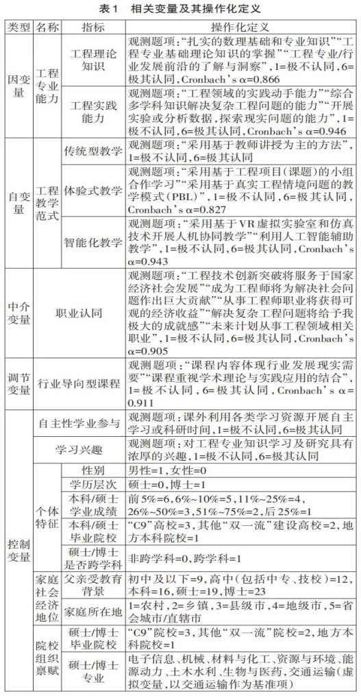 本研究的调节变量是行业导向型课程,是指面向企业实际发展需要,课程内容与行业需求深度对接,旨在培养学生实践应用能力的课程类型。本研究的中介变量为职业认同,是指个体对工程师职业的价值、社会贡献、自我成就等方面的综合性认同感。为了更准确地预测教学范式对工程专业学位研究生专业能力的影响,本研究还将学生个体特征、家庭社会经济地位、院校组织禀赋、学习参与、专业兴趣等影响工程专业能力的相关变量予以控制,以期在控制这些变量的基础上更为精准地测量教学范式对工程专业学位研究生专业能力的预测效应。表1概括了本研究使用的相关变量及其操作化定义。