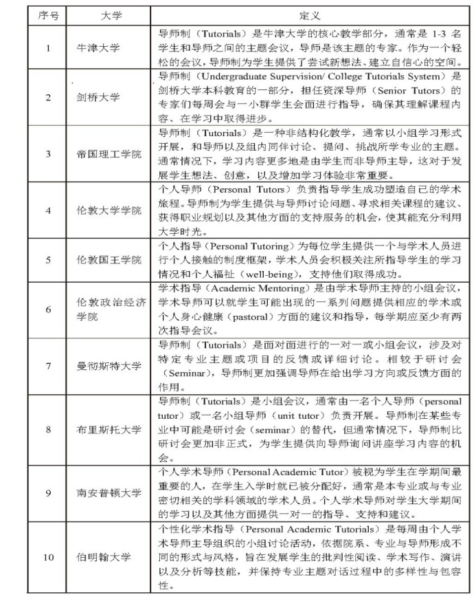 其次,在教学环节,教师的角色由招生导师转换为学业导师,这在英国研究型大学教育体系中被称为“导师制”(tutorials)。英国这种广为人知的“导师制”作为个性化教学方式,缘起于牛津大学和剑桥大学,是苏格拉底对话式教学法的形式延续。导师制这一被世界公认为能够“让本科生充满智慧”的教学方式,虽然在英国的研究型大学之间的定义有所差异(详见表1),除了“导师制”(tutorials),也有“本科指导”(undergraduate supervisions)、“学术指导”(academic mentoring)或者“个人指导”(personal tutoring)等名称,但从本质上看,都是由导师面向个别或少数学生群体的学术指导,组织形式一般是小规模会议,会议内容就专业讲座涉及到的某个主题或问题展开。总体来看,导师制具有很强的个性化色彩,导师可以根据学生情况,自主决定如何构建师生之间的互动形式以及对话内容。