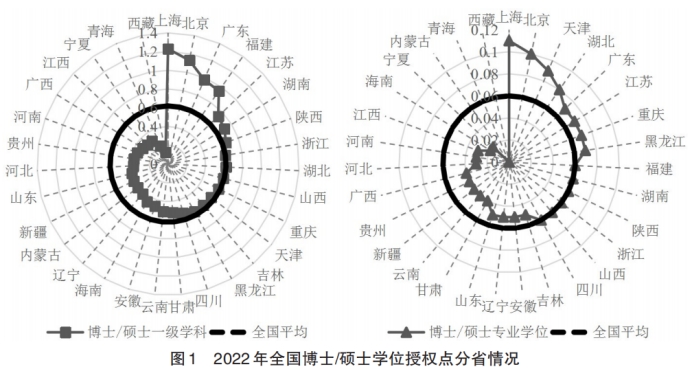 从最新的学术学位授权点的省域分布情况来看,2022年博士/硕士一级学科授权点相比的系数显示:北京(1.23)和上海(1.13)均超过1,为全国最高;广东(0.98)、福建(0.95)、江苏(0.74)、湖南(0.71)和陕西(0.66)五省的这一系数超过全国平均水平;浙江(0.62)、湖北(0.62)、山西(0.61)和重庆(0.60)的比例在0.6左右;这一比例在0.4以下的省份包括河北(0.37)、贵州(0.37)、河南(0.35)、广西(0.32)、江西(0.30)、宁夏(0.30)、青海(0.21)和西藏(0.13)。从最新的专业学位授权点的省域分布来看,2022年博士/硕士专业学位授权点相比的系数显示:上海(0.11)和北京(0.10)为全国最高;天津(0.09)、湖北(0.08)、广东(0.07)、江苏(0.07)、重庆(0.07)、黑龙江(0.07)六个省市的比例也均高于全国平均水平;福建、湖南、陕西、浙江、山西、四川六个省份的比例均为0.06;吉林、安徽、辽宁和山东四省为0.5;甘肃、云南、新疆、贵州、广西五省为0.4;河北、河南、江西、海南、宁夏、内蒙古、青海、西藏的这一比例均低于0.04。具体见图1所示。上述数据反映出,博士生教育资源在省与省之间不均衡分布的问题较为凸显。