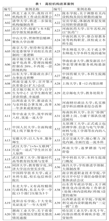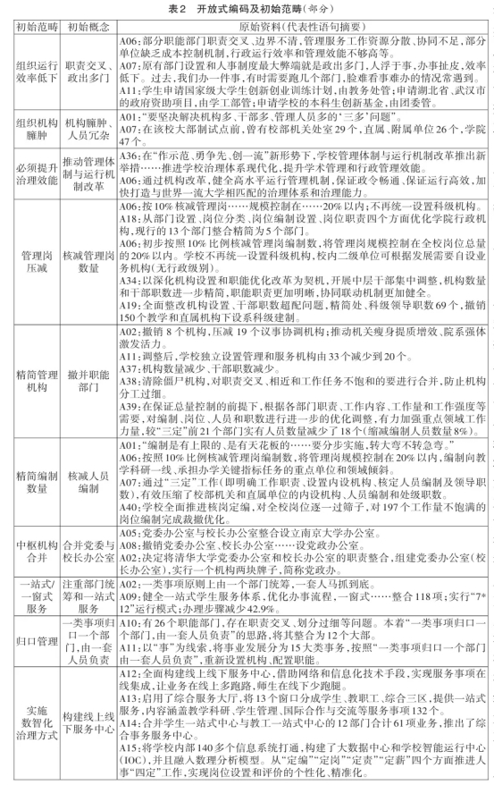 机构是维系高校组织运转的基本构件,是高校内部治理体系的重要支撑。为构建系统完备、科学规范和运行高效的职能体系,必须根据时代变迁和社会发展形势进行机构改革,应对组织机构发展过程中产生的各种沉疴顽疾。党的二十届二中全会审议通过的《党和国家机构改革方案》,是我国改革开放以来启动的第九轮机构改革,相比以往的改革举措力度更大、涉及面更广。高校作为国家事业单位的组成部分,同样需要优化机构设置和职能配备,提高治理效能。高校机构改革是高等教育综合改革的重要领域,应当以教育治理现代化为出发点,围绕系统完备、分工明确、运转高效的职能体系建设要求,积极开展实践探索。近些年来,伴随着高等教育的规模扩张,高校行政管理机构及管理人员也呈现快速增长的趋势,多数高校的行政机构数量保持在40-50个左右,涉及党群机构、行政组织机构及直属单位,内设机构迅速膨胀,层次繁多,出现党政领导多、管理机构多、管理人员多的现象,被形容为“校级干部一走廊,处级干部一礼堂,科级干部一操场”。高校组织机构设置普遍存在结构臃肿,职责交叉及行政官僚化倾向,进而超出学校运行的现实需求,导致人浮于事和效率低下等问题。为深度解释高校机构改革的深层次诱因,探索组织机构优化调整的实施路径,本研究采用基于扎根理论的典型案例分析法,对近期40所高校开展组织机构改革的案例进行分析,提炼出整体性的解释模型,提供可观照、可操作的具体举措。