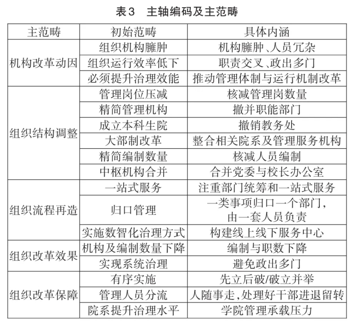 轴心编码及关联式登录的主要目的是建立概念范畴之间的联系,用于说明文本数据中嵌入的相互关系。采用施特劳斯等提出的编码典范模型作为核心分析框架。在概念合并和分类的基础上形成更广泛的类别,将开放编码衍生出的17个初始类别浓缩为5个主要类别,包括组织改革的驱动因素、组织结构调整、组织流程再造、组织改革成果和保障措施。(见表3)